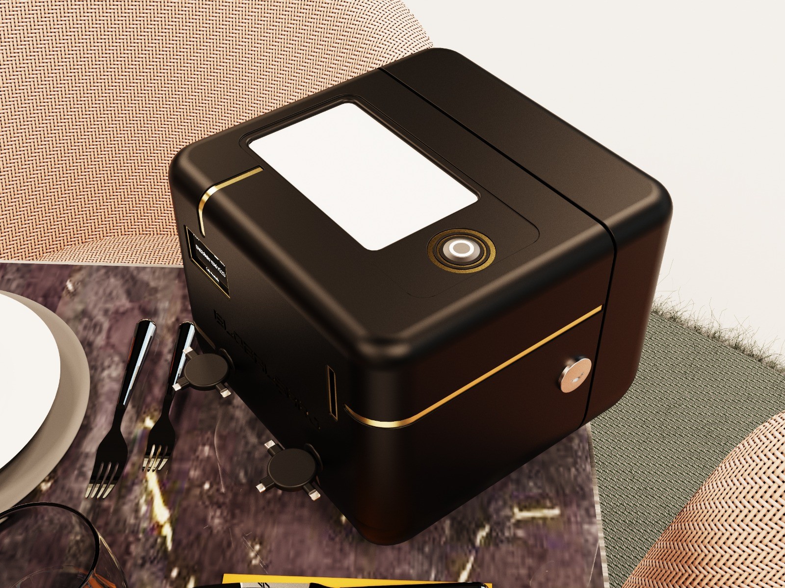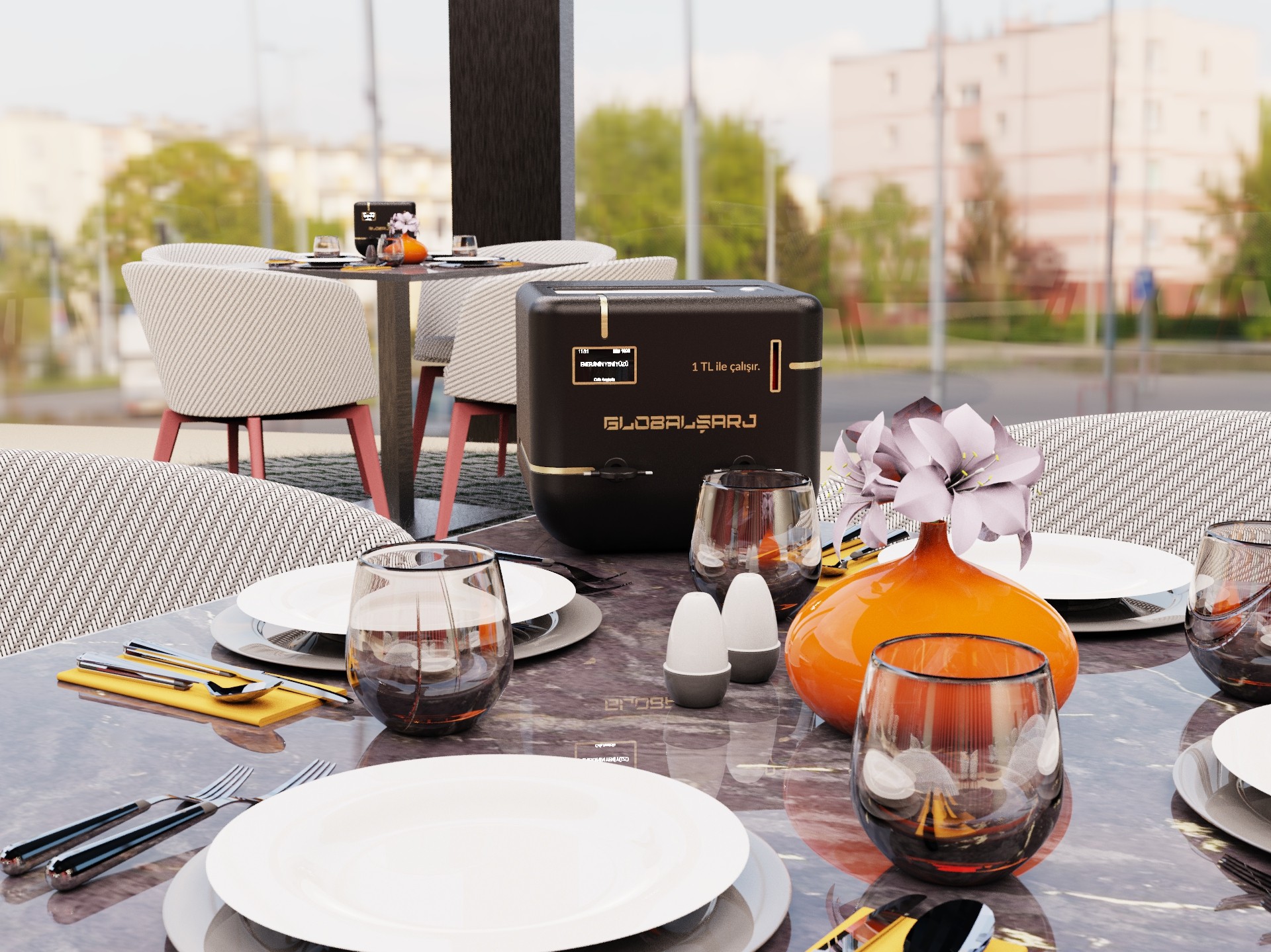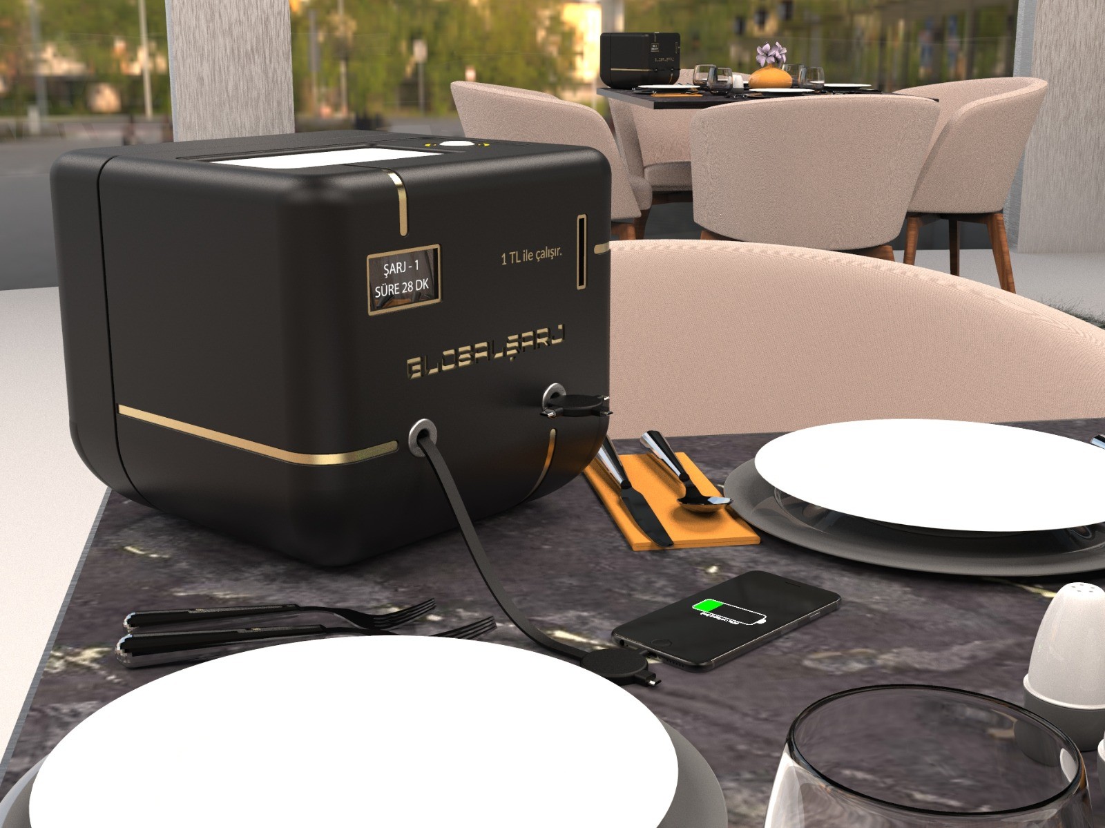 Globalşarj is a napkin holder with a built-in phone charging feature. It's designed to eliminate the hassle of finding a power socket to charge our phones in restaurants and cafes. The difference of Globalşarj compared to other solutions is its compact design and dual functionality as a napkin holder, which allows it to stay on the table at all times. Its sleek design creates a sleek, tech-inspired look while offering a button to easily call the waiter.